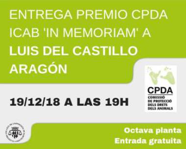 Nos complace confirmar el acto de entrega del PREMIO CPDA (Comisión de Protección de los Derechos de los Animales) "IN MEMORIAM" al Excmo. Decano Emérito Luis del Castillo Aragón (fallecido el pasado mes de Agosto de 2018) en reconocimiento a su trayectoria de dedicación y defensa de la protección de los Derechos de los Animales, el próximo Miércoles día 19 de Diciembre de 2018, en el Ilustre Colegio de Abogados de Barcelona (ICAB).