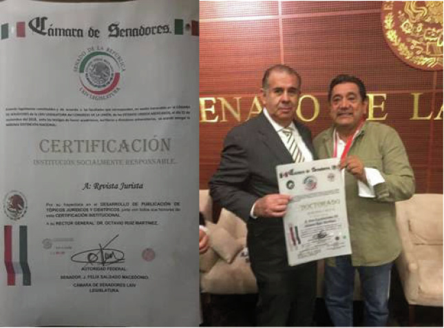 El Jurista Octavio Ruiz Martínez, Doctorado Honoris Causa por su relevante trayectoria científica y sus sobresalientes méritos en la profesionalización de las generaciones de abogados, otorgándosele todos los derechos, privilegios y honores inherentes al Posgrado Doctoral, nos comunica que, el pasado 22 de Noviembre de 2018, la Revista “Jurista”, publicación especializada en temas de Derecho e impartición de Justicia que tan destacadamente dirige, ha recibido de la Cámara de Senadores de los Estados Unidos de México la máxima distinción nacional: