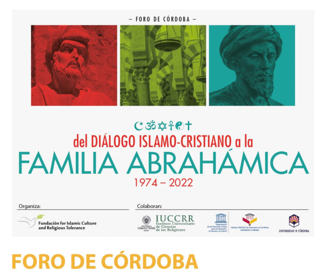 que organiza la entidad española “FUNDACIÓN FOR ISLAMIC CULTURE & RELIGIOUS TOLERANCE" (FICRT), en colaboración con el Instituto Universitario de Ciencias de las Religiones de la Universidad Complutense y con la Cátedra Unesco de Resolución de Conflictos de la Universidad de Córdoba, y que se celebrará los días 16 y 17 de mayo de 2022, en la sede de Córdoba de Casa Árabe.