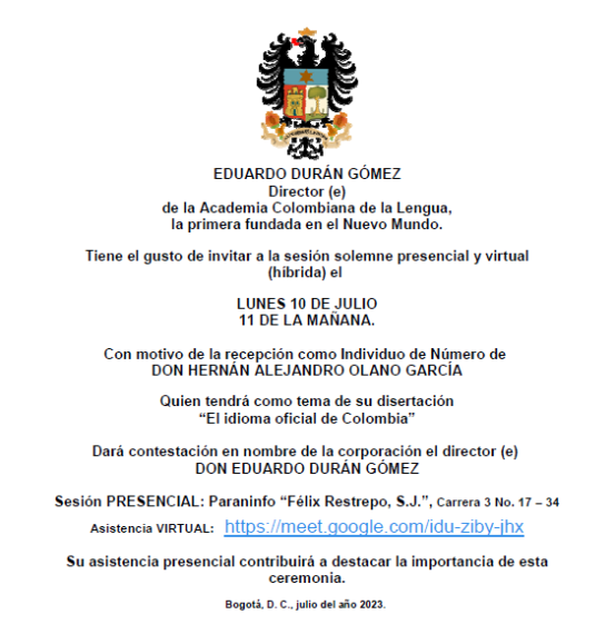 ACADEMIA COLOMBIANA DE LA LENGUA. RECEPCIÓN COMO INDIVIDUO DE NÚMERO DEL: