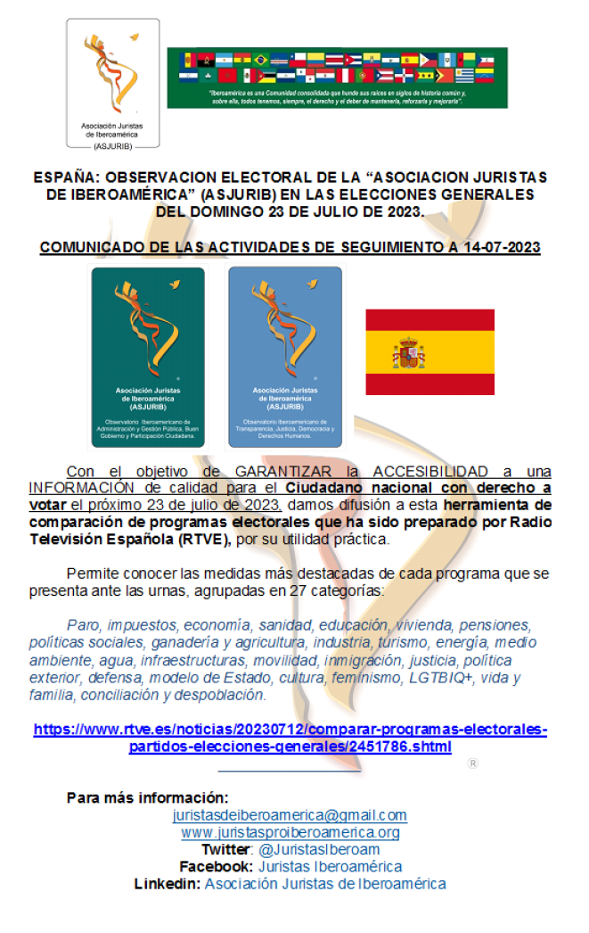 ESPAÑA: OBSERVACION ELECTORAL DE LA “ASOCIACION JURISTAS DE IBEROAMÉRICA” (ASJURIB) EN LAS ELECCIONES GENERALES DEL DOMINGO 23 DE JULIO DE 2023.