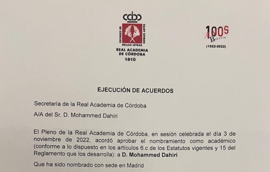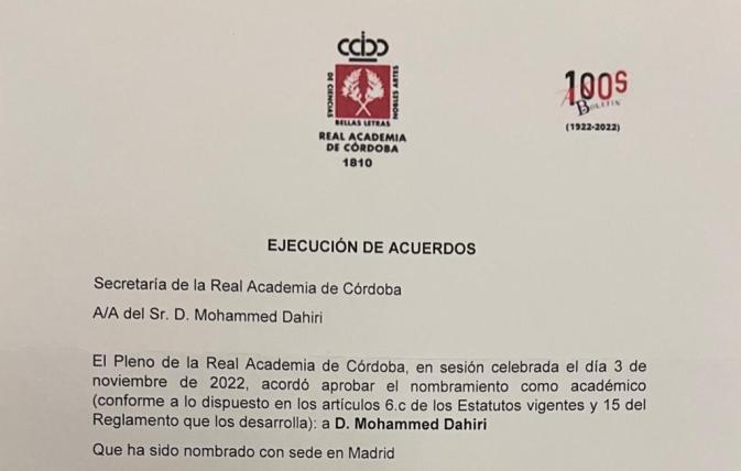 En sesión celebrada el 3 de noviembre de 2022, la “Real Academia de Ciencias, Bellas Letras y Nobles Artes de Córdoba”, que preside el Excmo. Sr. Dr. José Cosano Moyano, aprobó, por votación, el nombramiento del Dr. Mohammed Dahiri como Académico Correspondiente, en la provincia de Madrid.