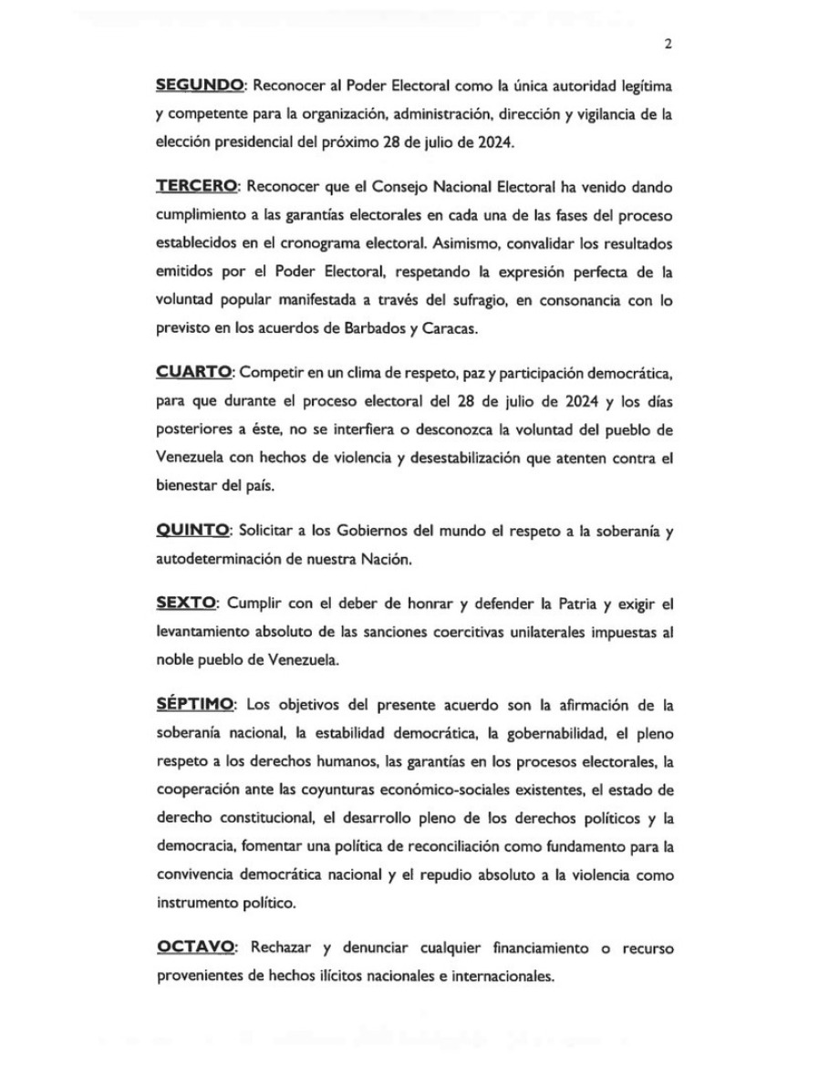 Las elecciones están precedidas por el Acuerdo de Barbados (2023), firmado entre el gobierno y la oposición, sobre la promoción de derechos políticos y garantías electorales para todos los venezolanos.