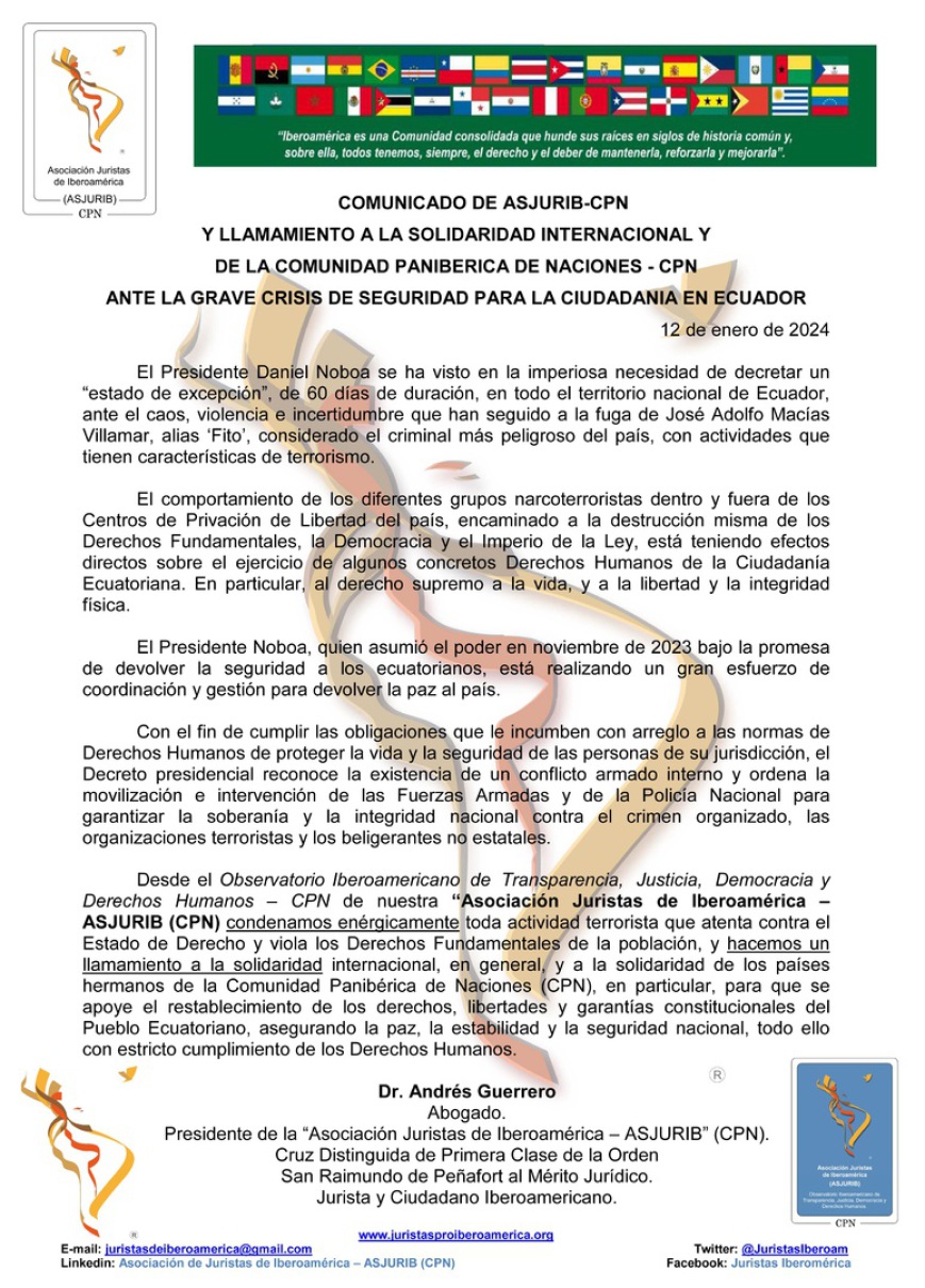 El COMUNICADO de fecha 28 de enero de 2024 que nos entrega nuestro Presidente, el Jurista y Ciudadano Iberoamericano Dr. Andrés Guerrero emitido por el Capítulo Español del Bloque Constitucional de Venezuela, del que él es miembro honorario, y que preside el Dr. Carlos J. Sarmiento Sosa, miembro activo de nuestra entidad, y del que extractamos y destacamos alguno de sus párrafos: