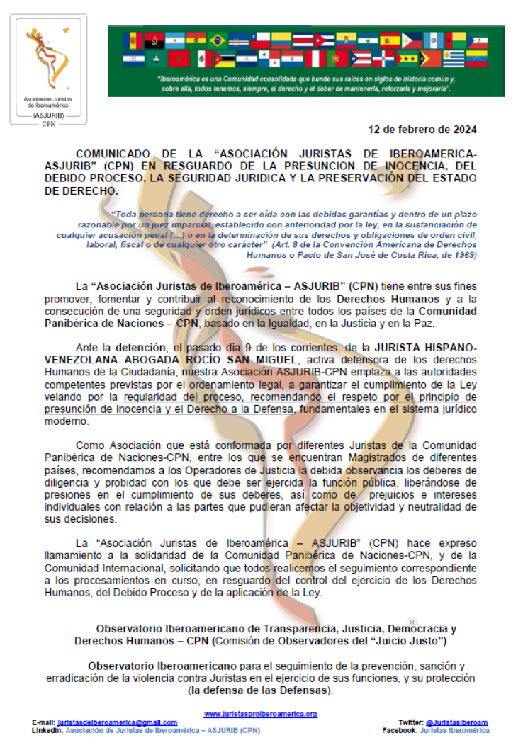 Estando manifiestamente sensibilizados con todo hecho que suponga vulneración de los Derechos Humanos, con la promoción de los valores de una sociedad democrática y con el respeto del Estado de Derecho, y más concretamente, con la situación general que atraviesa la Ciudadanía Venezolana, desde el Observatorio Iberoamericano de Transparencia, Justicia, Democracia y Derechos Humanos de nuestra “Asociación Juristas de Iberoamérica – ASJURIB (CPN), COMPARTIMOS, APOYAMOS Y DIFUNDIMOS: