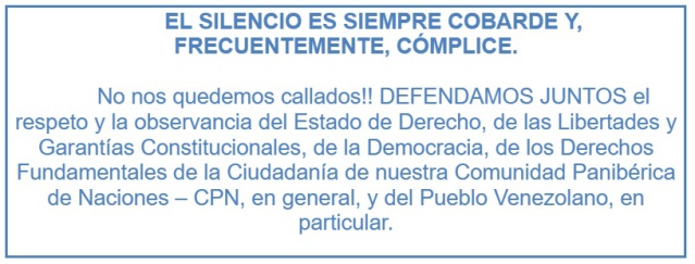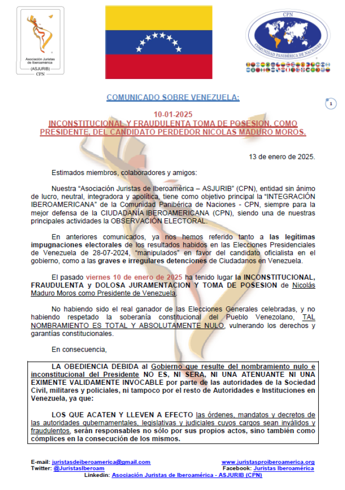 Estando manifiestamente sensibilizados con todo hecho que suponga vulneración de los Dere-chos Humanos, con la promoción de los valores de una sociedad democrática y con el respeto del Estado de Derecho, y más concretamente, con la grave situación que atraviesa, en general, la Ciudadanía Venezolana, especialmente, desde la celebración de las Elecciones Presidenciales de 28 de julio de 2024, por mediación de nuestro Presidente, el Jurista y Ciudadano Iberoamericano Dr. Andrés Guerrero, desde el OBSERVATORIO IBEROAMERICANO DE TRANSPARENCIA, JUSTICIA, DEMOCRACIA Y DERECHOS HUMANOS - CPN de nuestra “Asociación Juristas de Iberoamérica – ASJURIB (CPN), COMPARTIMOS, APOYAMOS Y DIFUNDIMOS LA REFLEXION ACADEMICA Y EL LLAMADO INTERNACIONAL que firma el Jurista argentino Gerardo E. Vega, bajo el título: