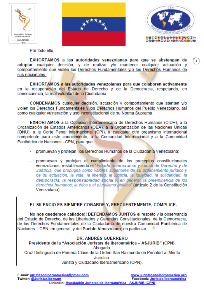 Desde nuestra “Asociación Jurista de Iberoamérica – ASJURIB” (CPN), SEGUIMOS EXHORTANDO: