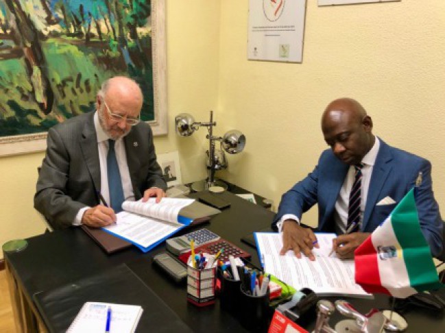 La Cátedra y su convenio se ha firmado, en París, por la Subdirectora General de Educación de la UNESCO, Dra. Stefania Giannini y por el Rector de la AAUCA, Dr. Paulo Speller, en presencia, entre otras autoridades, del Director General de Enseñanza Universitaria e Investigación de Guinea Ecuatorial, Dr. Pergentino Esangui Ondo, y del Sr. Embajador Carmelo Nvono-Ncá, Delegado Permanente de Guinea Ecuatorial ante la UNESCO.